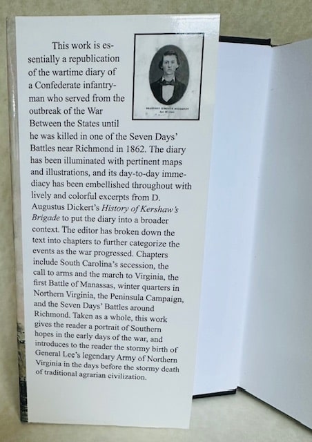 The wartime diary of a Confederate infantryman who served from the outbreak of the War Between the States until he was killed in one of the Seven Days’ Battles near Richmond in 1862. The diary has been illuminated with pertinent maps and illustrations, and its day-to-day immediacy has been embellished throughout with lively and colorful excerpts from D. Augustus Dickert’s “History of Kershaw’s Brigade” to put the diary into a broader context. Chapters include South Carolina’s secession, the call to arms and the march to Virginia, the first Battle of Manassas, winter quarters in Northern Virginia, the Peninsula Campaign and the Seven Days’ Battles around Richmond. This work gives the reader a portrait of Southern hopes in the early days of the War and introduces to the reader the stormy birth of General Lee’s legendary Army of Northern Virginia.