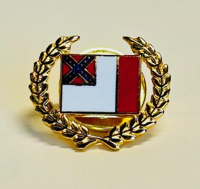 These beautiful Confederate lapel pins are MADE IN AMERICA. Available in Southern Cross (measures 7/8″ x 7/8″), I Pledge Allegiance to these Flags (7/8″ x 7/8″), 1st National, 2nd National, 3rd National, Bonnie Blue or Battle Flag. All flag wreath lapel pins measure 3/4″W x 5/8″H with clutch back. These are beautiful pins!