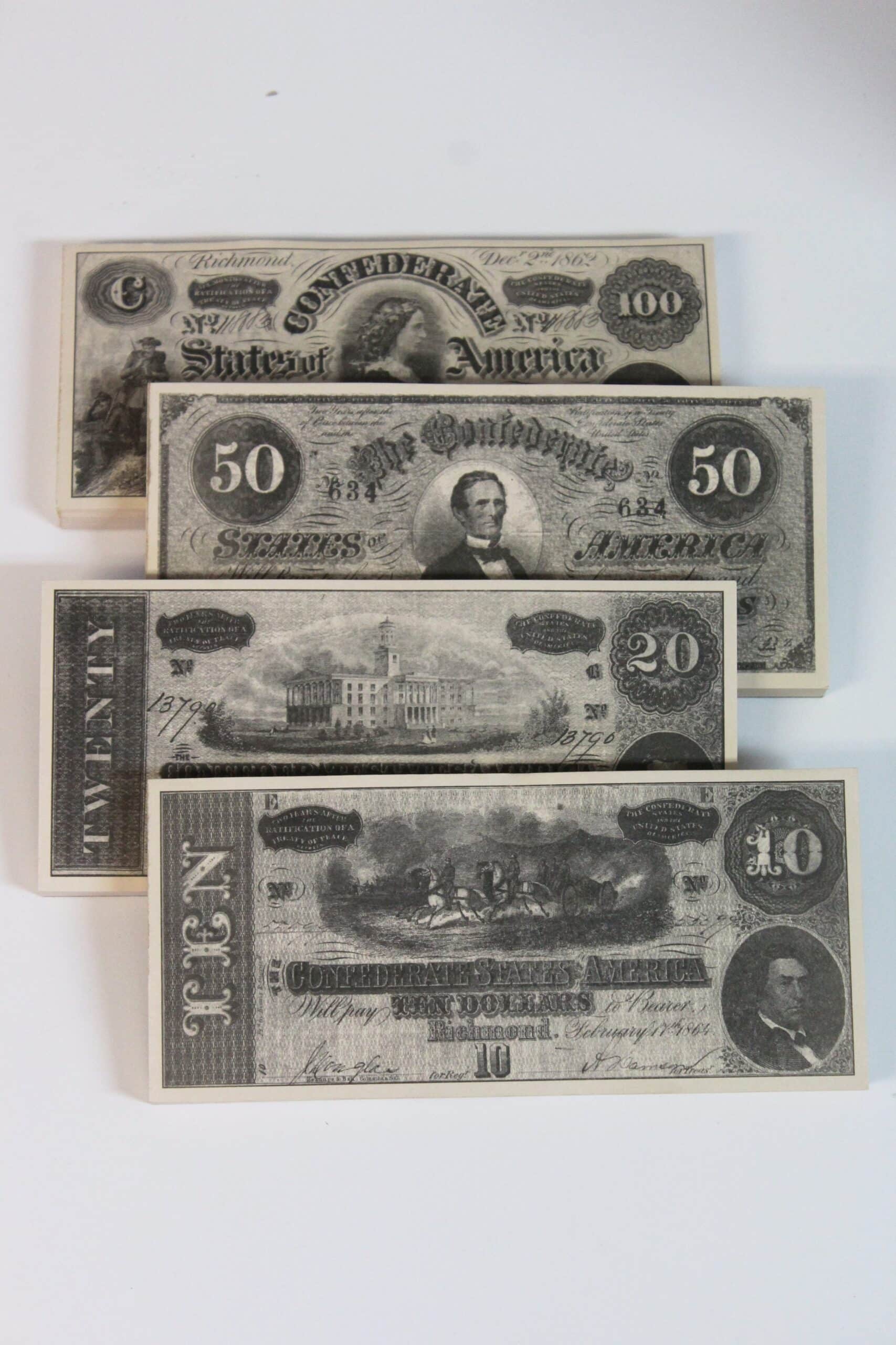 “CSA” recruiting currency comes as 100 of each denomination($10, $20, $50, $100), each with a different historical anecdote/recruiting message on the back.