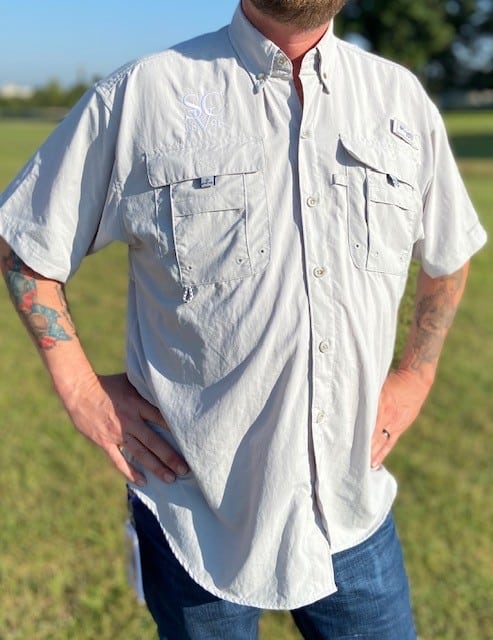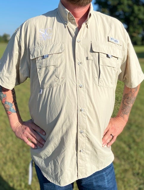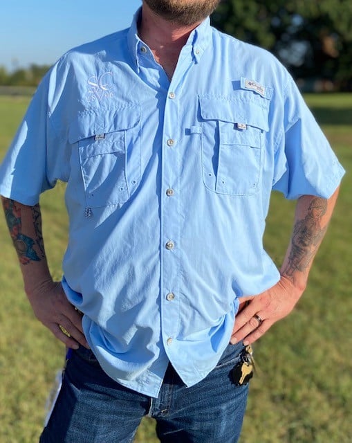 These high-quality Columbia fishing shirts come in four colors: Light Gray, Aqua, Khaki and Sky Blue. We have sizes Medium through 2x. Runs about one size too large.