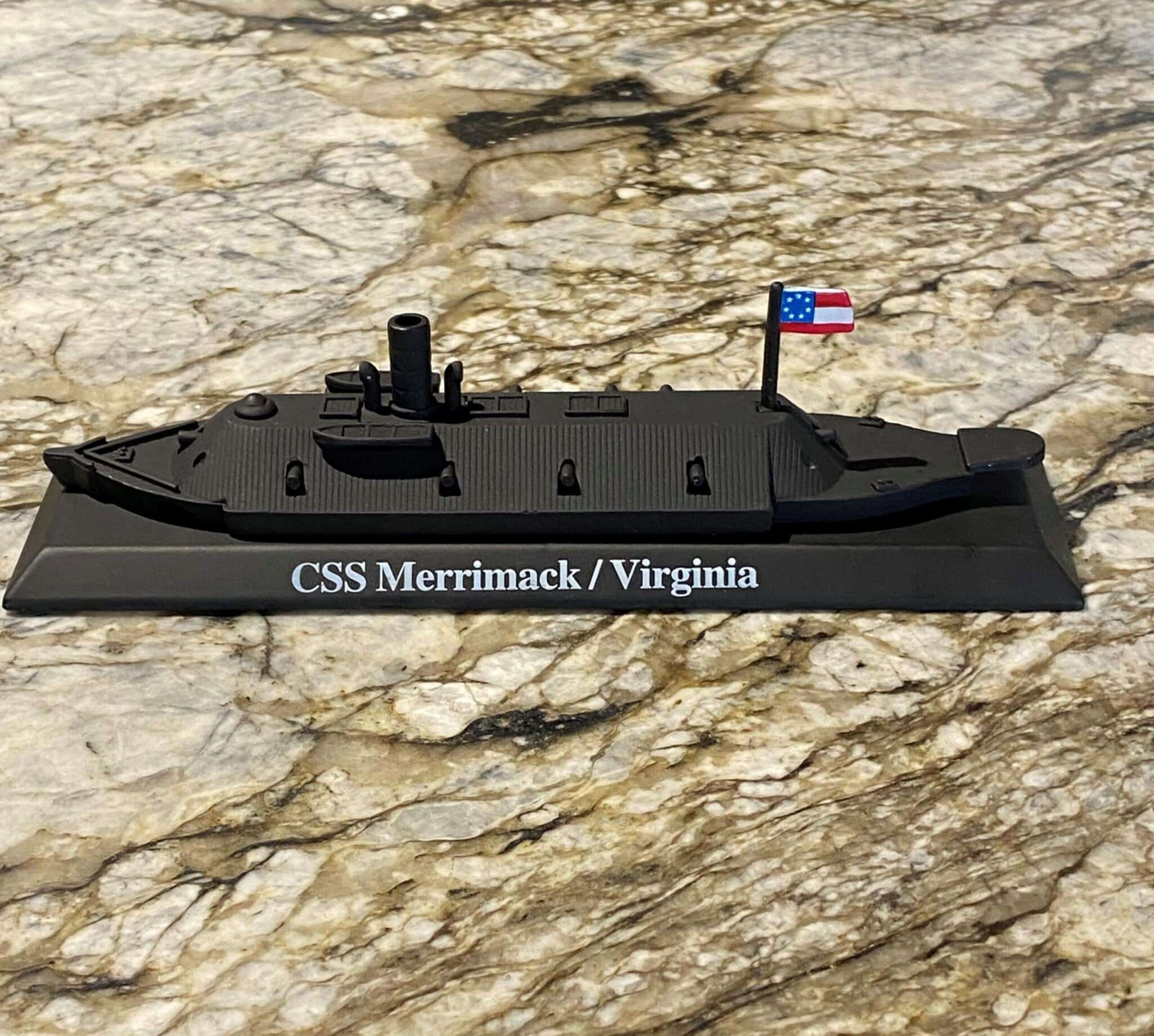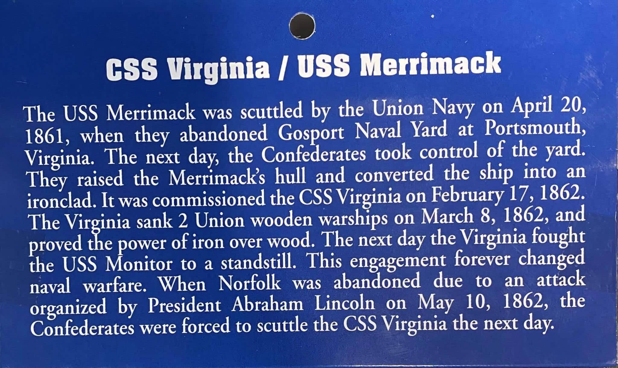 First Known as the USS Merrimack before she was scuttled on April 20th 1861. The next day the confederates took control of the area and raised the hull of the Merrimack and converted her into the Confederate Ironclad commissioned as the CSS Virginia.
