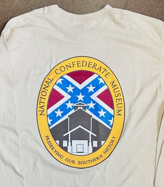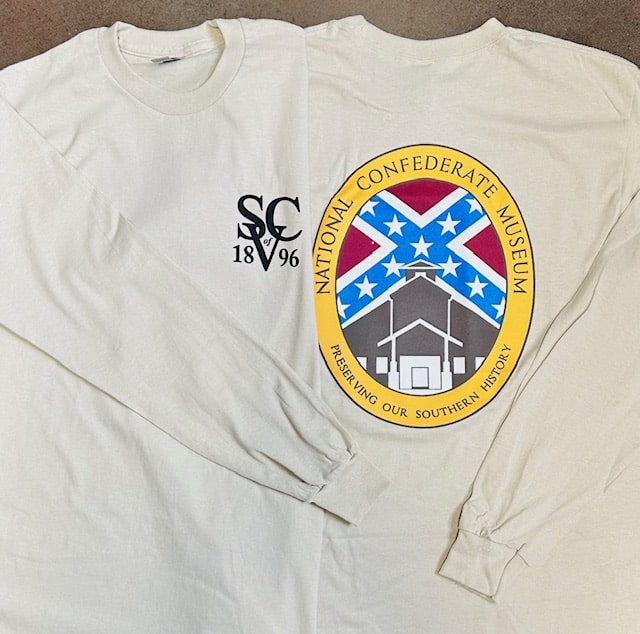 100% cotton, long sleeved t-shirts that have the National Confederate Museum logo in full color on the back and the SCV 1896 logo on the front left breast. Cream color. LIMITED SIZING AVAILABLE.