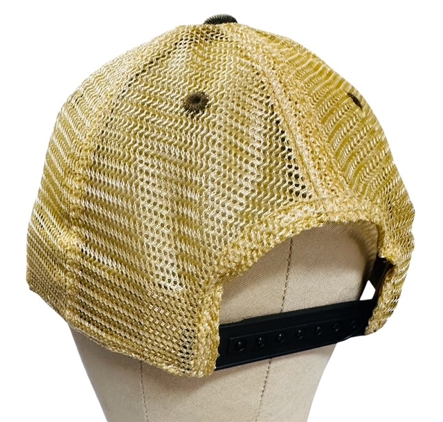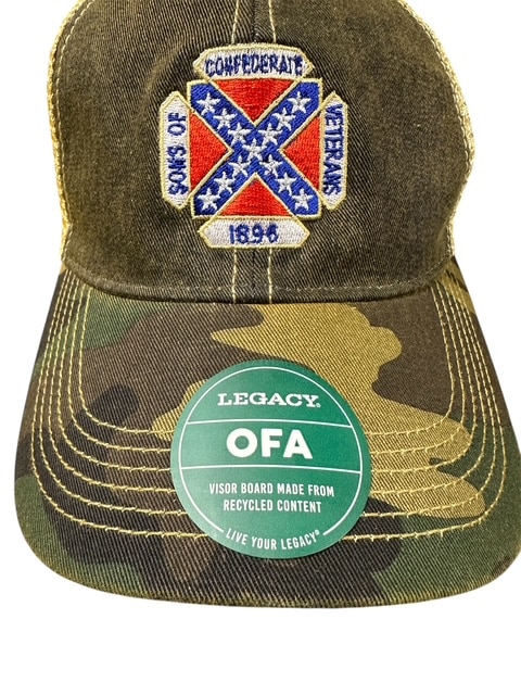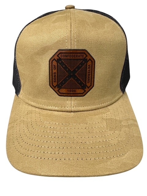 2.) Distressed black unstructured crown with camo visor. Tan stitching and mesh – full color embroidered SCV logo. Made by Legacy. Adjustable back.