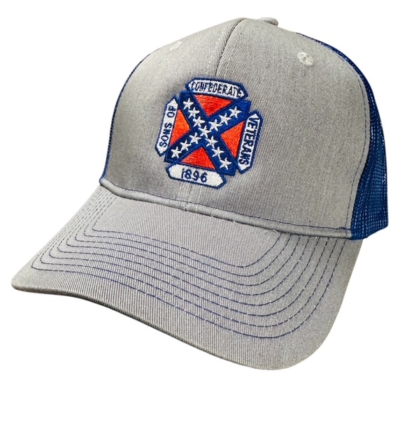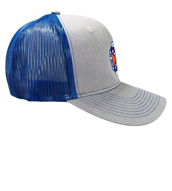 1.) Light gray structured crown and visor. Royal blue stitching and mesh – full color embroidered SCV logo. Adjustable back.